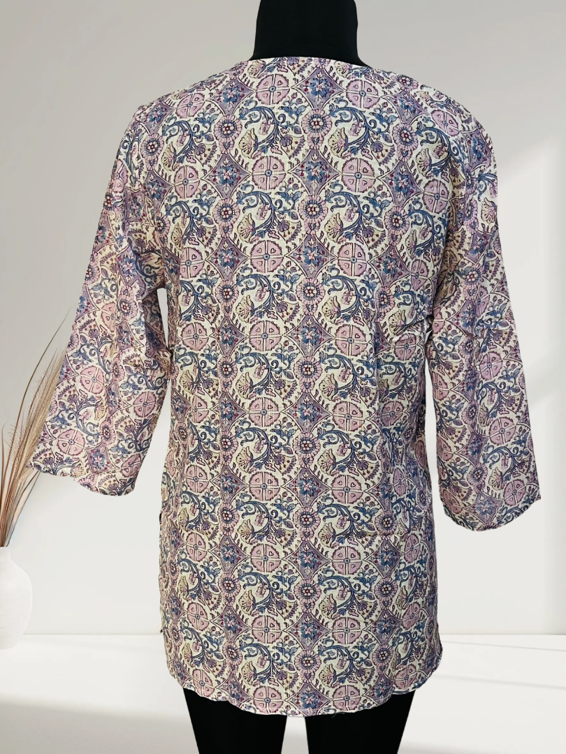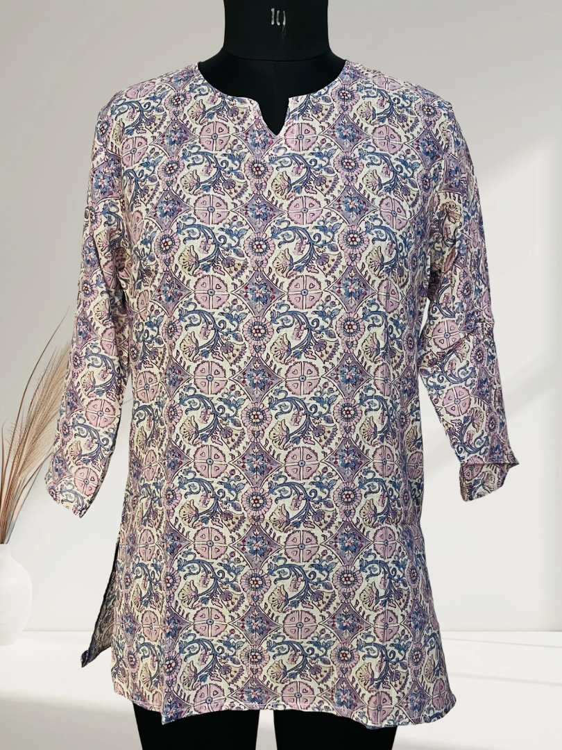 & Free ShippingGraceful soft pastel printed kurti top with 3/4th sleeves and side slits – perfect for everyday comfort and office style